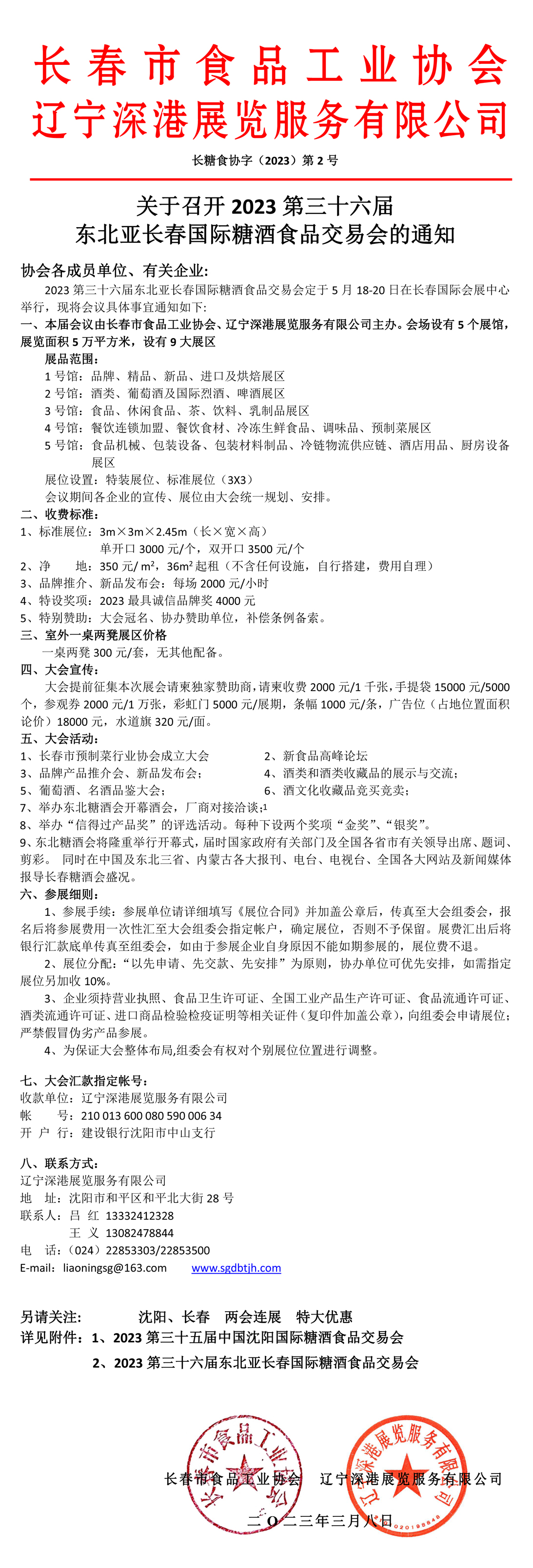 協(xié)會各成員單位、有關(guān)企業(yè): 2023第三十六屆東北亞長春國際糖酒食品交易會定于5月18-20日在長春國際會展中心舉行,現(xiàn)將會議具體事宜通知如下: 一、本屆會議由長春市食品工業(yè)協(xié)會、遼寧深港展覽服務(wù)有限公司主辦。會場設(shè)有5個展館,展覽面積5萬平方米,設(shè)有9大展區(qū) 展品范圍: 1號館:品牌、精品、新品、進口及烘焙展區(qū) 2號館:酒類、葡萄酒及國際烈酒、啤酒展區(qū) 3號館:食品、休閑食品、茶、飲料、乳制品展區(qū) 4號館:餐飲連鎖加盟、餐飲食材、冷凍生鮮食品、調(diào)味品、預(yù)制菜展區(qū) 5號館:食品機械、包裝設(shè)備、包裝材料制品、冷鏈物流供應(yīng)鏈、酒店用品、廚房設(shè)備展區(qū) 展位設(shè)置:特裝展位、標(biāo)準(zhǔn)展位(3X3) 會議期間各企業(yè)的宣傳、展位由大會統(tǒng)一規(guī)劃、安排。 二、收費標(biāo)準(zhǔn): 1、標(biāo)準(zhǔn)展位:3m×3m×2.45m(長×寬×高) 單開口3000元/個,雙開口3500元/個 2、凈 地:350元/ m2,36m2起租(不含任何設(shè)施,自行搭建,費用自理) 3、品牌推介、新品發(fā)布會:每場2000元/小時 4、特設(shè)獎項:2023最具誠信品牌獎4000元 5、特別贊助:大會冠名、協(xié)辦贊助單位,補償條例備索。 三、室外一桌兩凳展區(qū)價格 一桌兩凳300元/套,無其他配備。 四、大會宣傳: 大會提前征集本次展會請柬獨家贊助商,請柬收費2000元/1千張,手提袋15000元/5000個,參觀券2000元/1萬張,彩虹門5000元/展期,條幅1000元/條,廣告位(占地位置面積論價)18000元,水道旗320元/面。 五、大會活動: 1、長春市預(yù)制菜行業(yè)協(xié)會成立大會 2、新食品高峰論壇 3、品牌產(chǎn)品推介會、新品發(fā)布會; 4、酒類和酒類收藏品的展示與交流; 5、葡萄酒、名酒品鑒大會; 6、酒文化收藏品競買競賣; 7、舉辦東北糖酒會開幕酒會,廠商對接洽談; 8、舉辦“信得過產(chǎn)品獎”的評選活動。每種下設(shè)兩個獎項“金獎”、“銀獎”。 9、東北糖酒會將隆重舉行開幕式,屆時國家政府有關(guān)部門及全國各省市有關(guān)領(lǐng)導(dǎo)出席、題詞、剪彩。 同時在中國及東北三省、內(nèi)蒙古各大報刊、電臺、電視臺、全國各大網(wǎng)站及新聞媒體報導(dǎo)長春糖酒會盛況。 六、參展細(xì)則: 1、參展手續(xù):參展單位請詳細(xì)填寫《展位合同》并加蓋公章后,傳真至大會組委會,報名后將參展費用一次性匯至大會組委會指定帳戶,確定展位,否則不予保留。展費匯出后將銀行匯款底單傳真至組委會,如由于參展企業(yè)自身原因不能如期參展的,展位費不退。 2、展位分配:“以先申請、先交款、先安排”為原則,協(xié)辦單位可優(yōu)先安排,如需指定展位另加收10%。 3、企業(yè)須持營業(yè)執(zhí)照、食品衛(wèi)生許可證、全國工業(yè)產(chǎn)品生產(chǎn)許可證、食品流通許可證、酒類流通許可證、進口商品檢驗檢疫證明等相關(guān)證件(復(fù)印件加蓋公章),向組委會申請展位;嚴(yán)禁假冒偽劣產(chǎn)品參展。 4、為保證大會整體布局,組委會有權(quán)對個別展位位置進行調(diào)整。